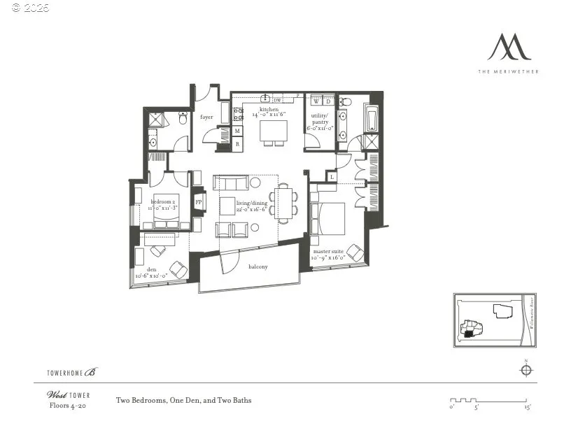 This stunning 2 bedroom, 2 parking spot south waterfront condo features one of the most sought after floor plans in all of the prestigious Meriwether Building. The large gourmet kitchen features custom cabinets, quartz countertops, two Miele convection ovens, gas cooktop with range hood, spacious island and ample storage. The gas-plumbed covered balcony offers space for year-round enjoyment with views of the Willamette River, Mt. Hood and city. The inviting living room has a cozy gas fireplace, large dining space perfect for hosting and an adjoining multi-functional den/flex space. The primary ensuite offers high end carpet, double closets with custom built ins and a beautiful bathroom. The spare bedroom is strategically placed on the other end of the unit and enjoys close proximity to second bathroom and beautiful city views. The coveted Meriwether offers an abundance of lifestyle amenities including 24/7 concierge, a large recreation room for parties/events, private guest parking, rentable guest suite, bike & kayak storage and beautiful courtyards. So close to the Riverwalk, shopping, restaurants, streetcar, OHSU and all the south waterfront has to offer!