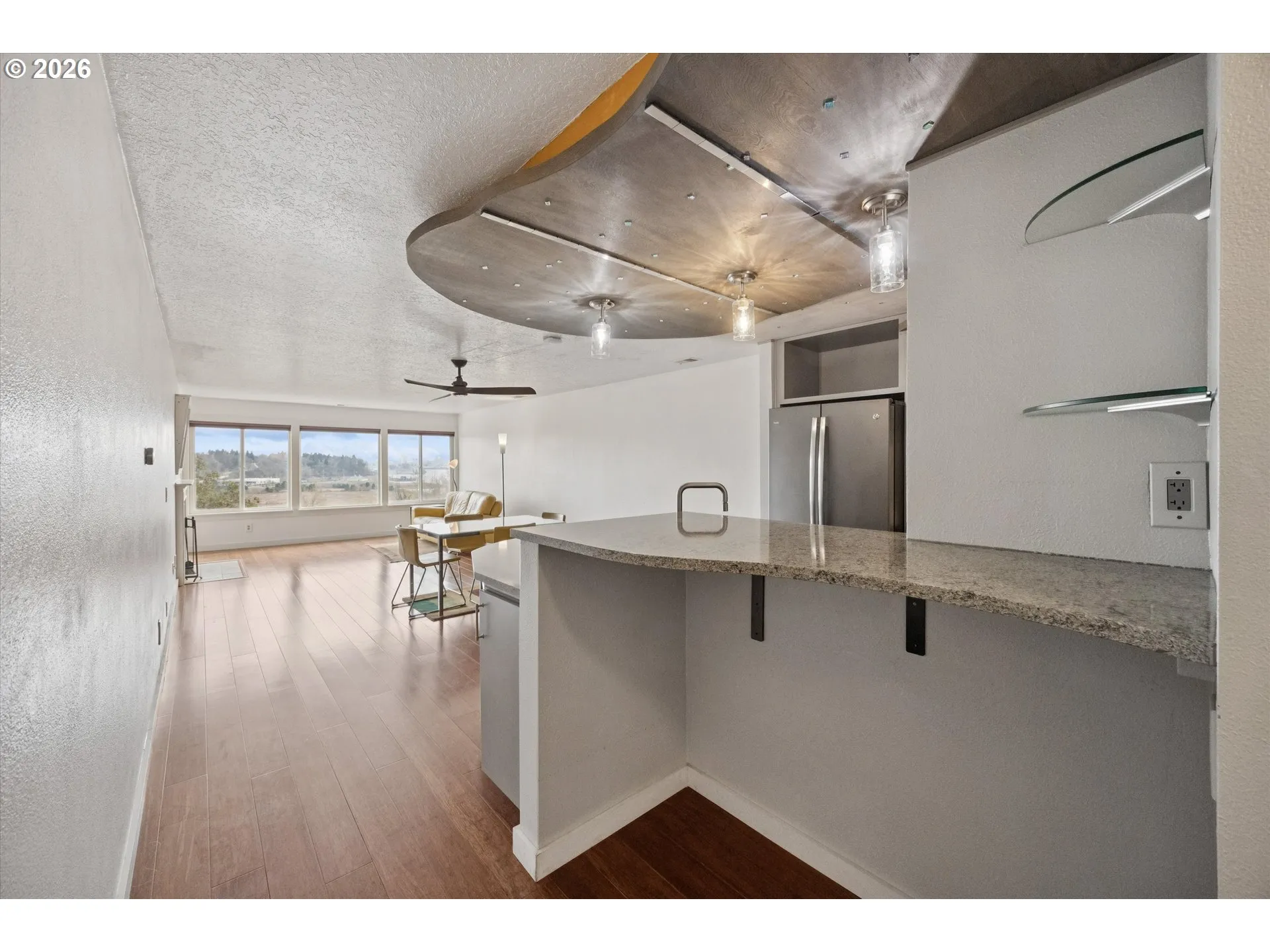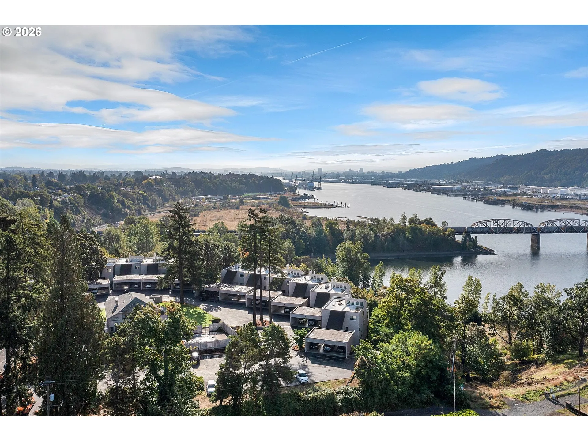 Updated riverfront condo in St. Johns offering main-level living with no stairs and sweeping Willamette River views. Move-in ready. Laminate floors and an open floor plan define the main living space, complemented by a cozy fireplace. Large windows overlook the natural river setting and provide excellent bird-watching opportunities. The kitchen features stainless steel appliances, tile backsplash, and a functional layout that flows into the dining and living areas. A spacious deck, accessible from both the living room and primary bedroom, offers a peaceful outdoor retreat with river views.Located in a quiet community with access to a pool and clubhouse. The unit includes a conveniently located parking space directly in front – one-level living, and is close to St. Johns shops, dining, and neighborhood amenities.