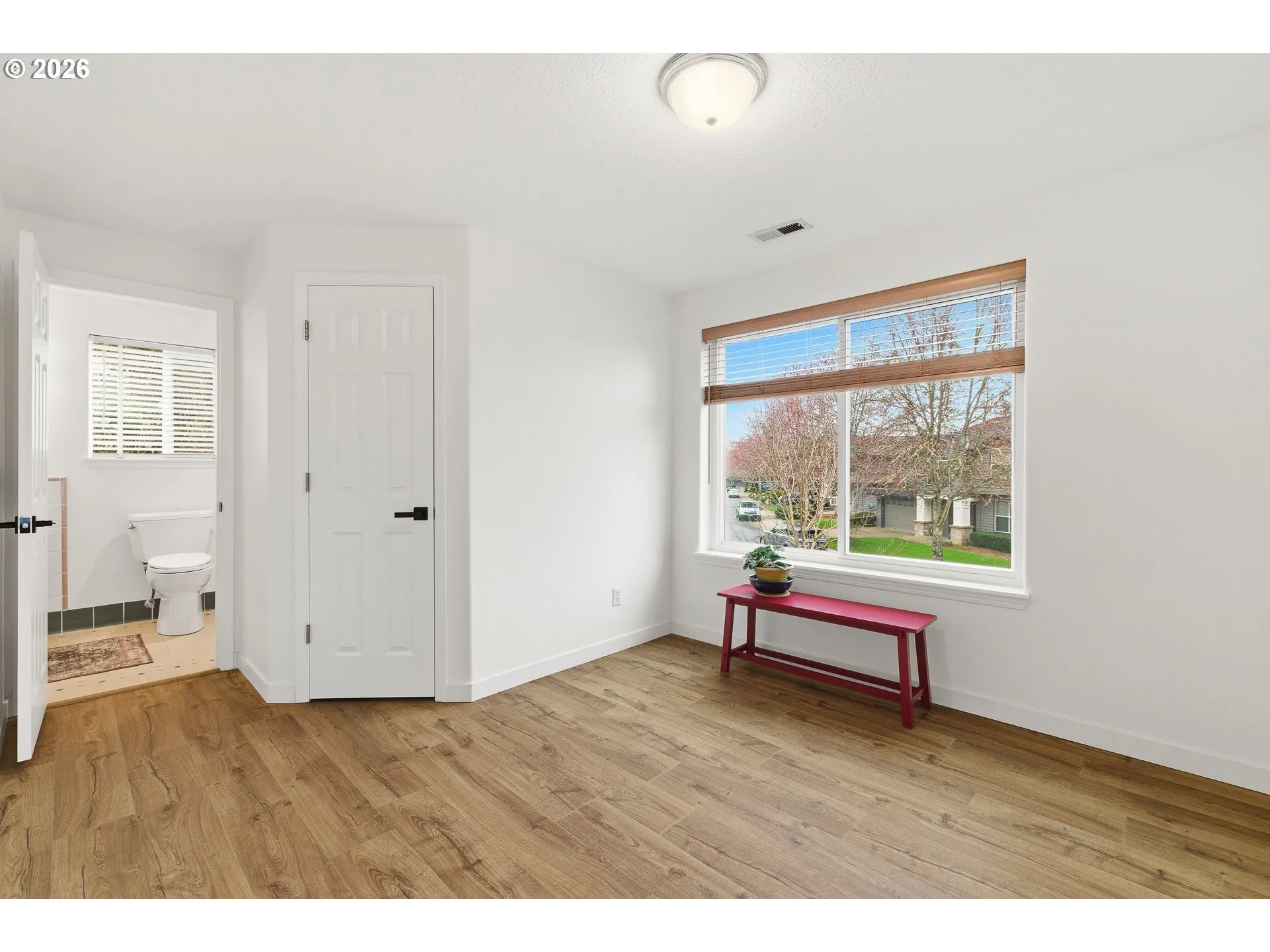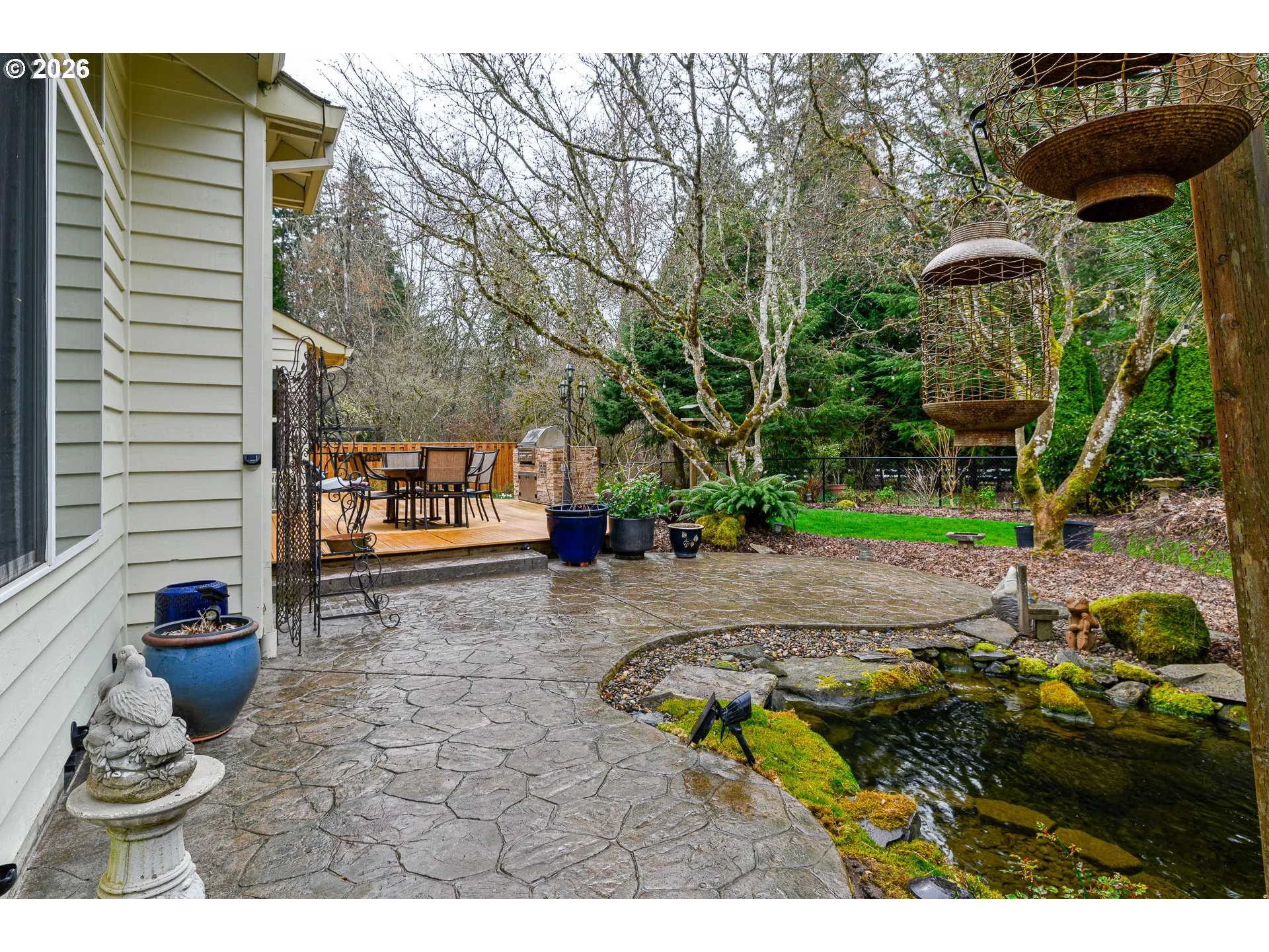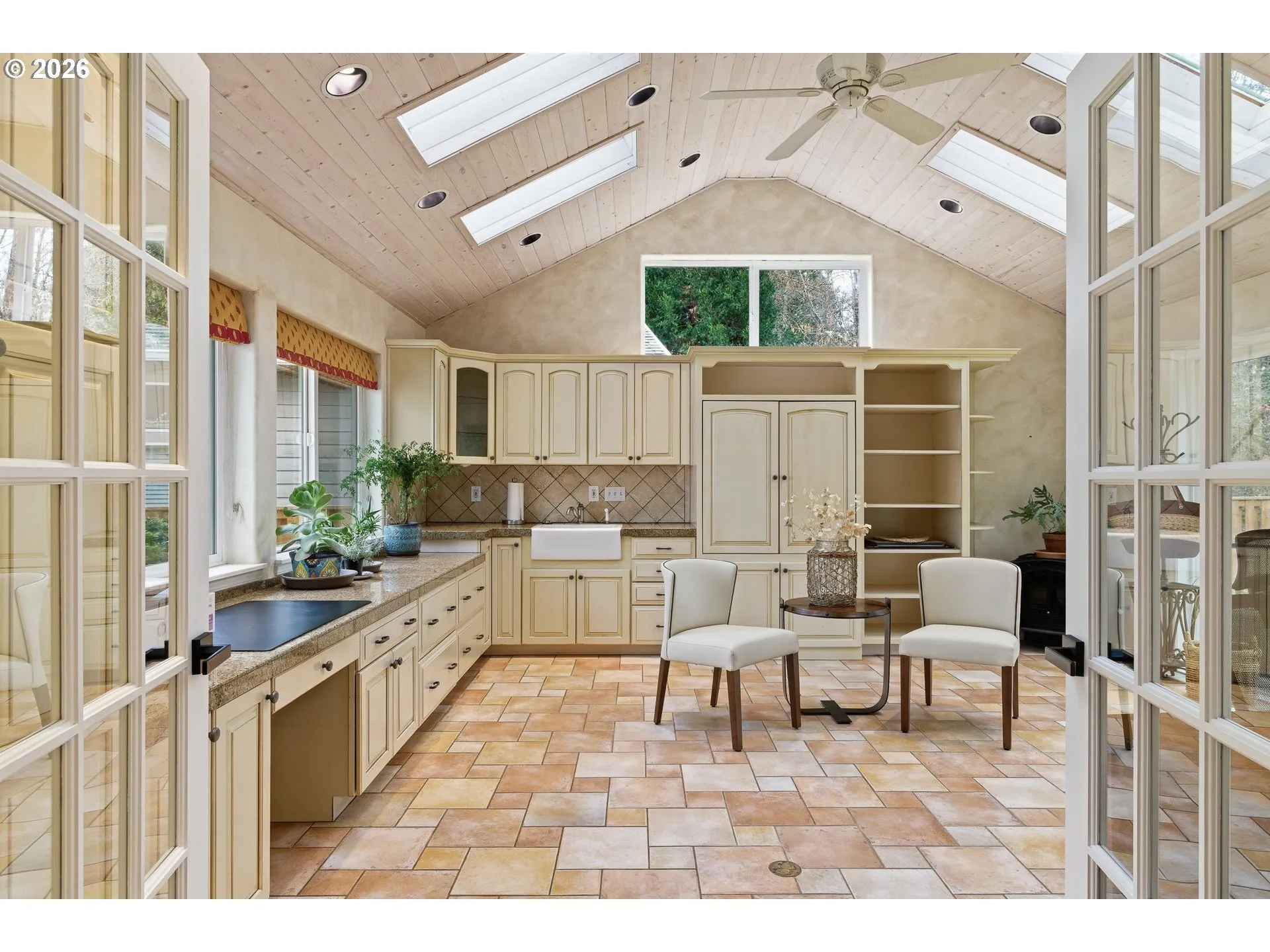 High vaulted ceilings, abundant natural light, warm wood tones, and striking metal lighting create an inviting and distinctive home in this highly desirable neighborhood. The open entry welcomes you with picture windows, while angled vaulted ceilings in the living and dining areas create a unique yet comfortable gathering space. Engineered hardwood flooring flows seamlessly throughout. The kitchen opens to the nook and great room and features extensive built-ins, tile counters, a gas cooktop, double ovens, and a large pantry. The great room offers soaring ceilings, a cozy fireplace, and a wall of windows that frame tranquil garden views. French doors lead to a bright sunroom with vaulted ceilings, skylights, and access to the backyard—perfect as an office, bonus room, or flexible living space. Upstairs you’ll find the primary suite and two additional bedrooms connected by a Jack-and-Jill bath. The spacious primary includes custom floor-to-ceiling built-ins, double vanity, organized closet system, and walk-in shower. Set on a .25-acre lot, the backyard is a gardener’s retreat with raised beds, lush perennials, lawn areas, trellised vines, greenhouse, potting shed, and peaceful courtyard. Backing to expansive greenspace and walking trails, the setting offers exceptional privacy and connection to nature.