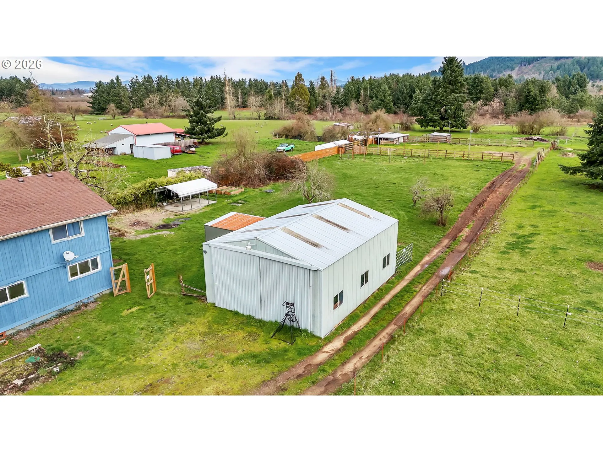 Nearly 3000 SQFT, 3-bedroom with office or 4th bedroom, 2.5-bath home offering versatile living spaces in a private setting with convenient access to town. The home features tall ceilings, abundant natural light, and a functional floor plan that includes both living and family rooms, a kitchen with a peninsula counter for casual seating, and a dedicated dining area. The upstairs primary suite overlooks the property and is accompanied by a second living space with a built-in bar, providing flexibility for entertaining, recreation, or additional lounge space. Exterior improvements include a detached studio suitable for guest quarters, home office, or creative use, a 24×30 shop, stalls, two fenced pastures, and an outdoor arena area with potential for restoration. Additional features include RV parking, ample storage, garden space, mountain views, and a peaceful setting well suited for those seeking space, usability, and lifestyle-oriented living.