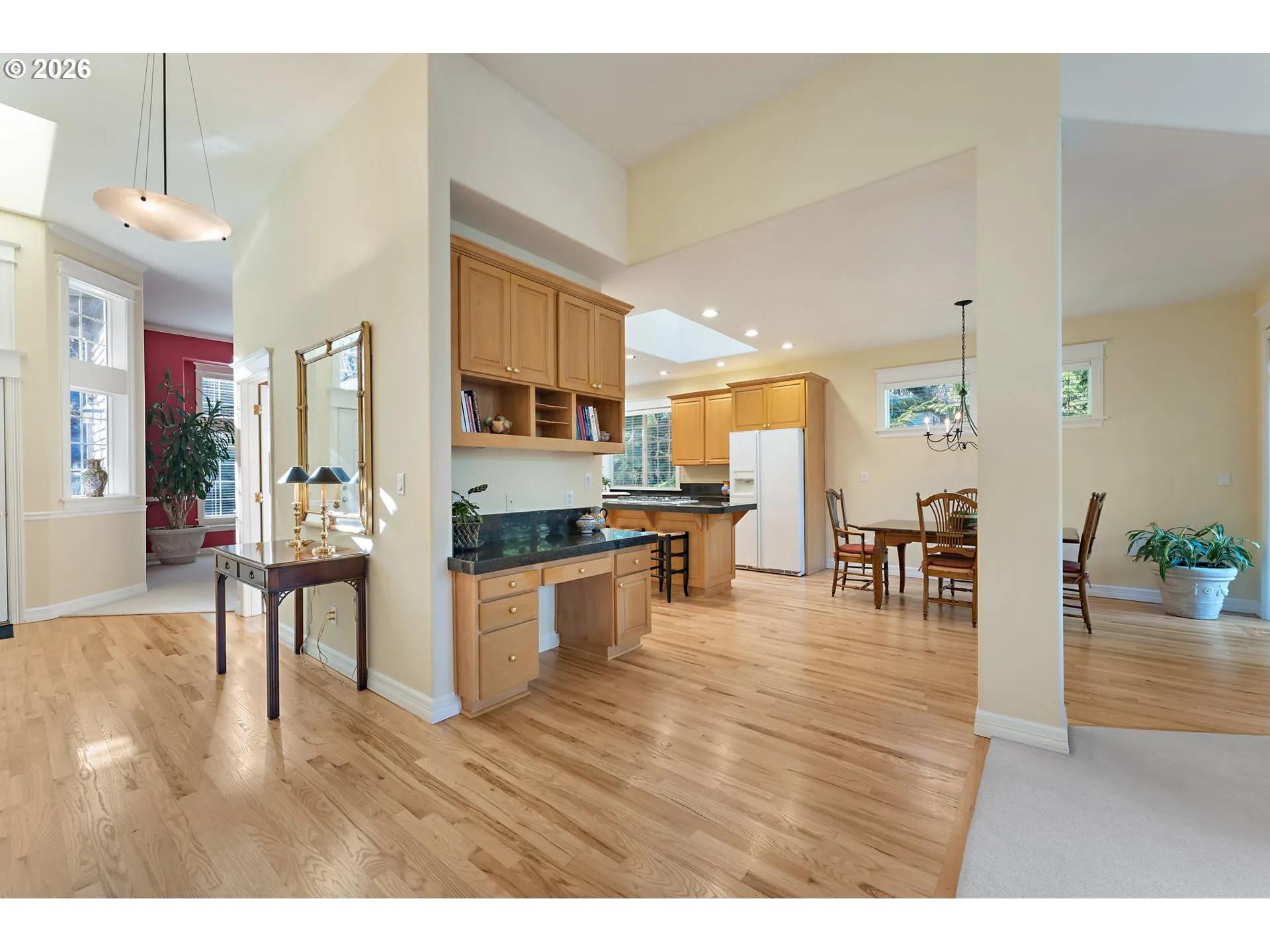 If you’re seeking privacy and convenience, look no further than this perfectly located Maplewood/Garden Home retreat. From the moment you step inside, you’ll feel a sense of peace and serenity as lush natural views greet you from every corner. Loved & meticulously maintained by the original owner, with elegant finishes & timeless features like soaring ceilings, refinished hardwood floors, and a flowing, circular layout that makes both everyday living and entertaining a breeze. Coveted main-level living includes a spectacular living room with a breathtaking wall of windows, an open chef’s kitchen, multiple dining areas, and a tranquil primary suite tucked away from the common spaces. A flexible upper level includes two large bedrooms, home office (or possible 4th bedroom), and an inspiring loft area, perfect for curling up with your favorite book. Dine, unwind, or entertain on the spacious wraparound deck while leaving yard work behind. A peaceful natural greenspace replaces the traditional backyard, and front yard maintenance is covered by a small, well-managed HOA. Newer roof & skylights, water heater, and refinished hardwoods. Sought-after SW PDX neighborhood, just moments to Multnomah Village restaurants and boutiques, Washington Square, schools, parks, and commuter routes. [Home Energy Score = 4. HES Report at https://rpt.greenbuildingregistry.com/hes/OR10243306]