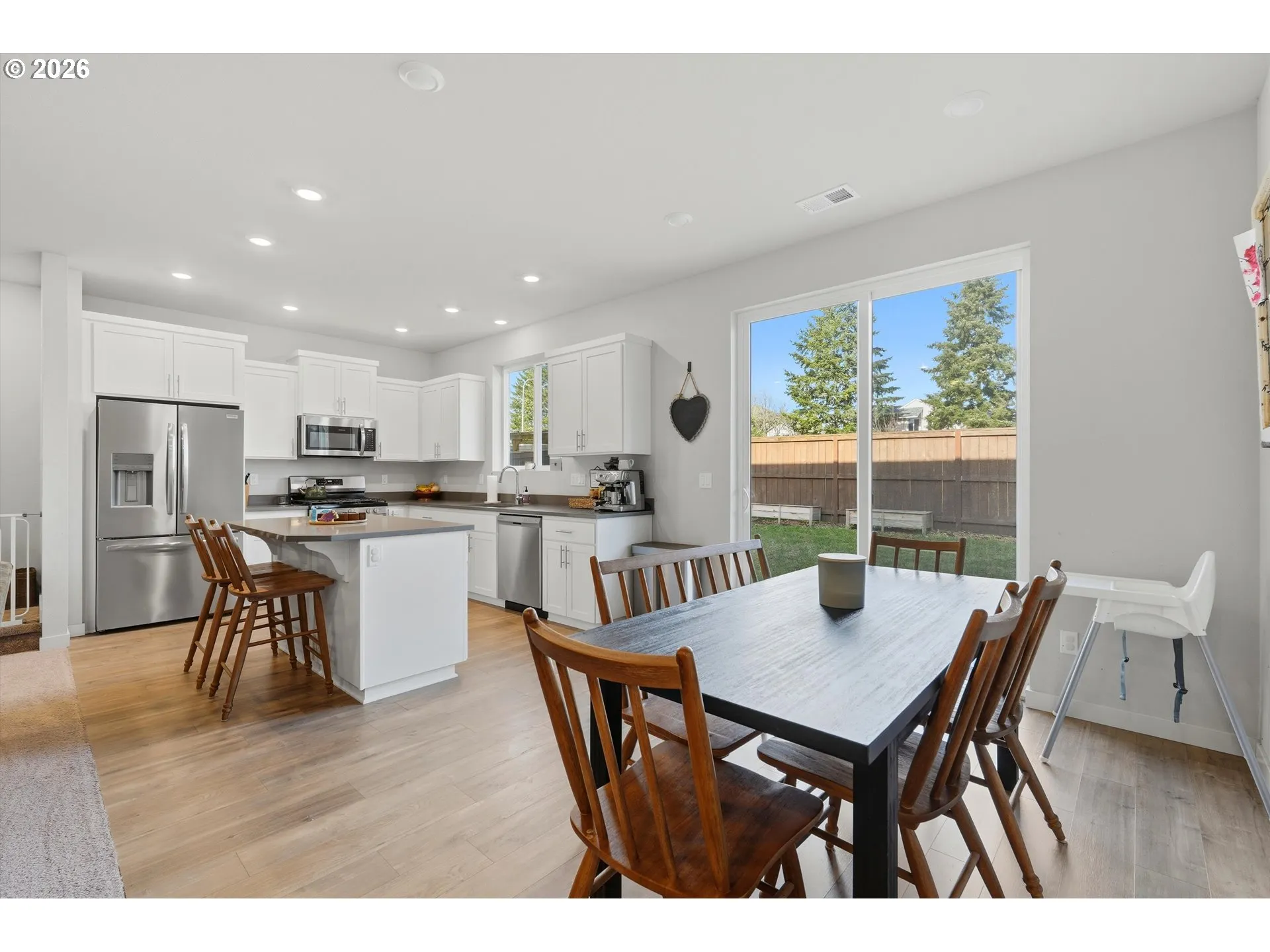 This Beautiful Contemporary Open floor plan with Kitchen, Dining and Living Room is located in the heart of Tualatin, Quartz counters and Stainless Steel appliances are all included, Step outside on to your patio thru sliding glass door into a private and fenced yard. All four bedrooms are found upstairs, including the luxurious owner’s suite with en-suite bathroom and walk-in closet. Customs window blinds for added privacy. Comfort in the summertime with A/C. Energy efficiency with a tankless water heater.