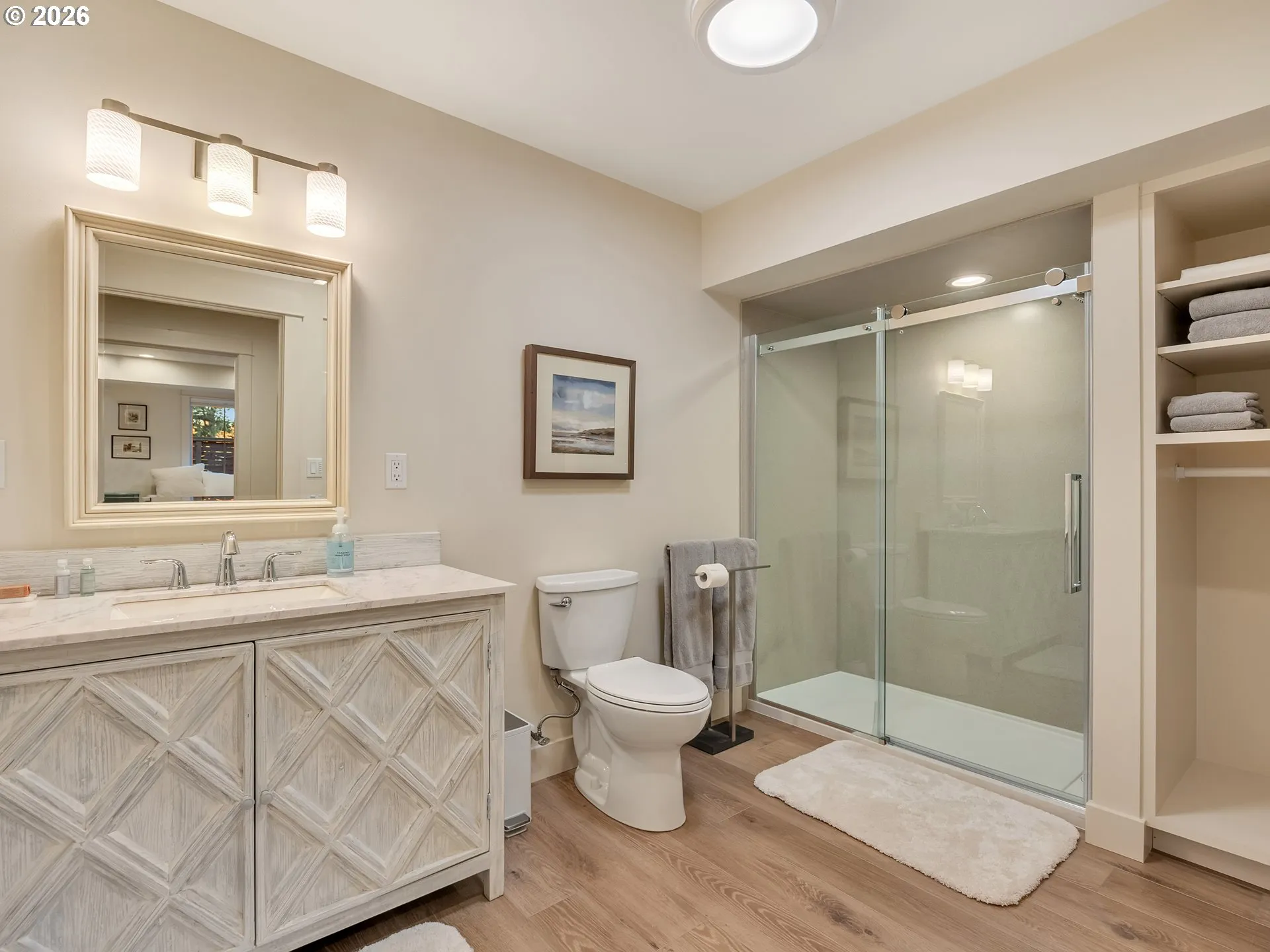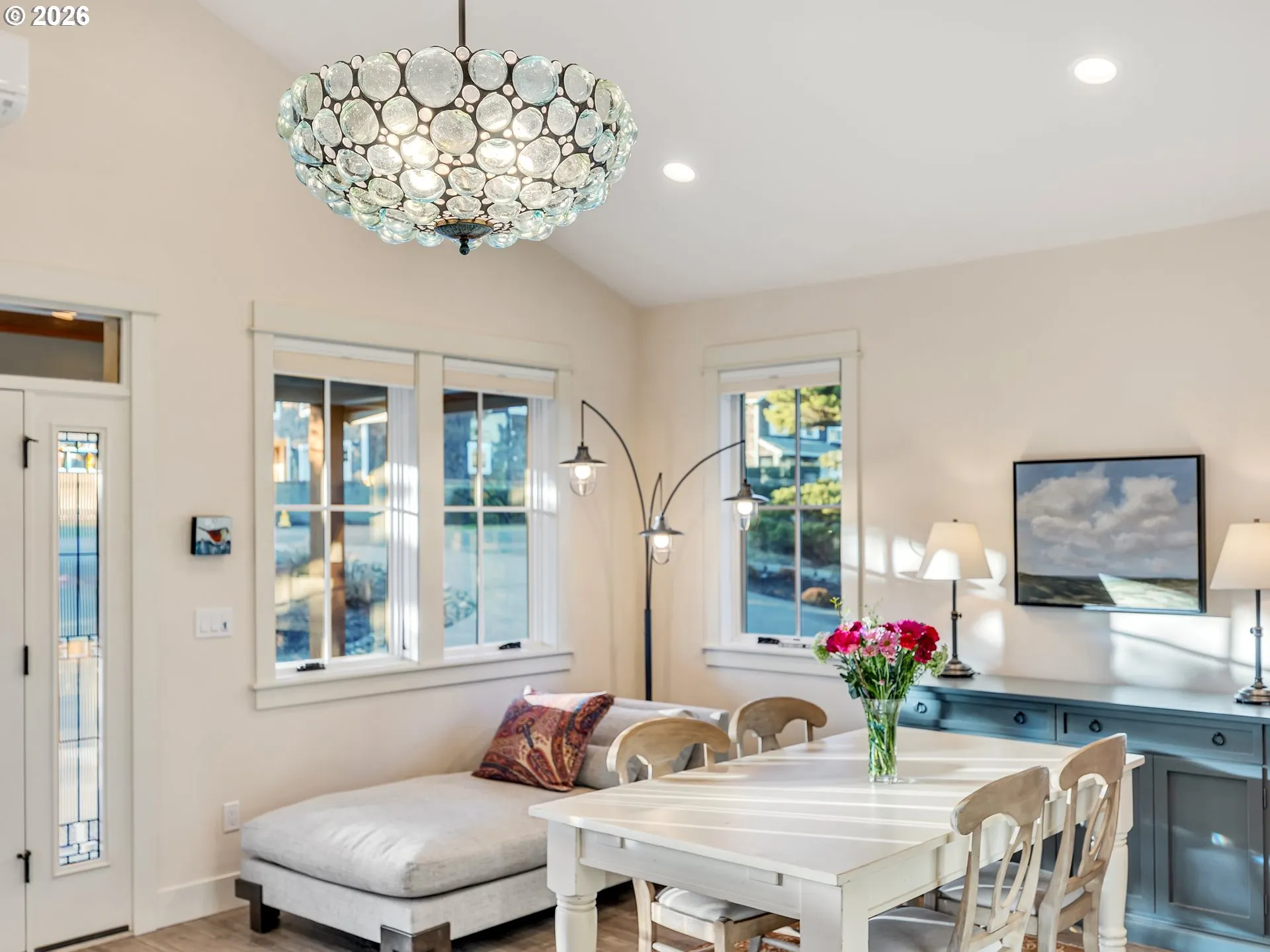 Custom-built in 2019, this well positioned home is within a few blocks of a beach access trail, an 18 hole golf course, eateries and a short bike-ride or stroll to downtown. Also a great place to view the start of the beloved July 4th parade from a wraparound deck with both covered and uncovered seating and raised garden beds on the south side. Inside, a thoughtfully designed open floor plan that spans a single level with generous windows allowing for natural light to flow throughout the great room and kitchen, a primary suite with walk-in closet and bath featuring custom tile flooring and floor to ceiling quartz tub/shower surround. A second bedroom and a full bath are also on main floor. The third bedroom is located within a separate 728 sq ft studio with its own exterior entrance-ideal for guests, multigenerational living, or extended stays. The studio offers a private bedroom, full bath, coffee bar with sink, under counter refrigerator and microwave. Plenty of storage spaces with an unfinished area for a future project. Much to enjoy. Home features list available.