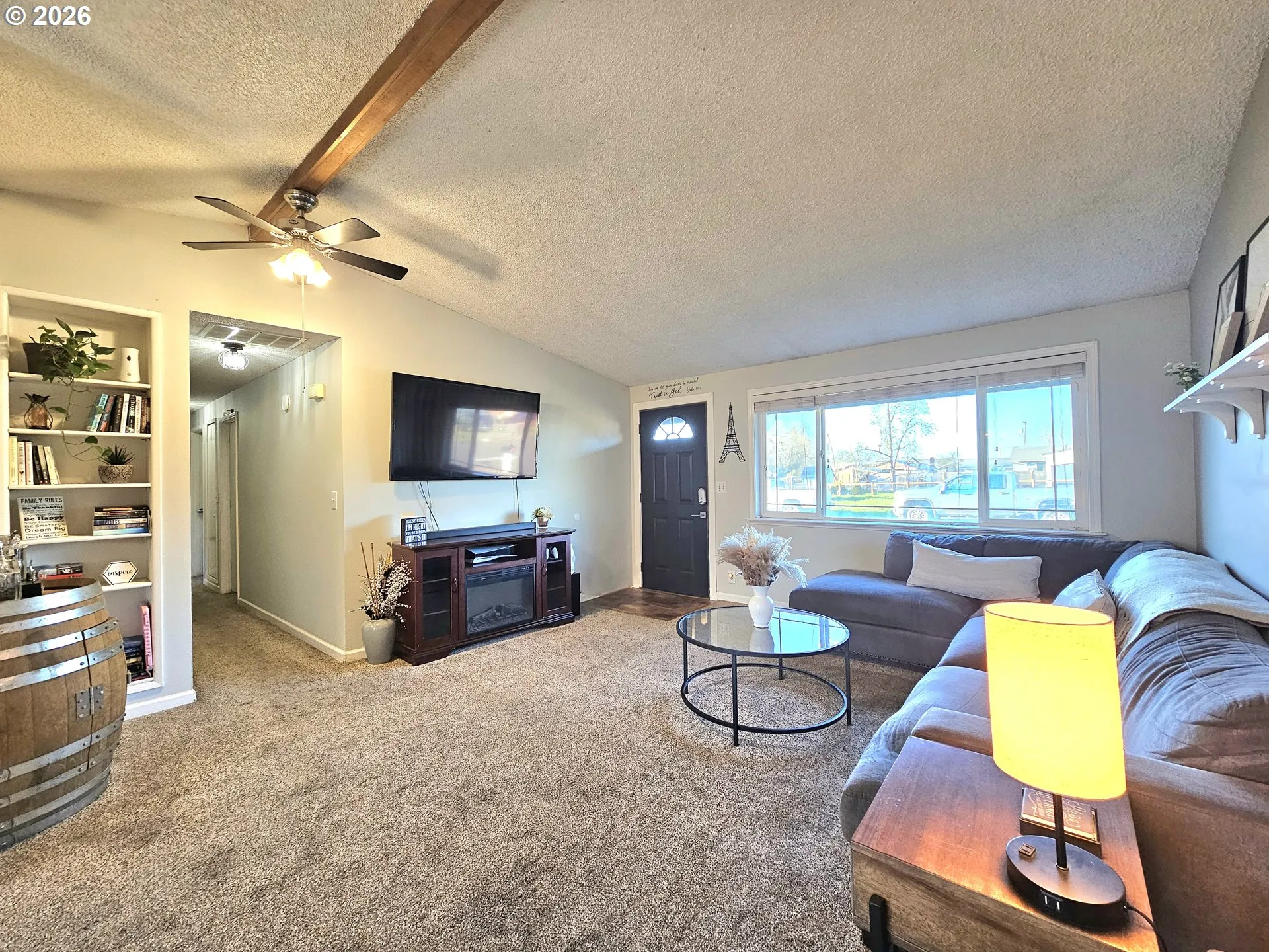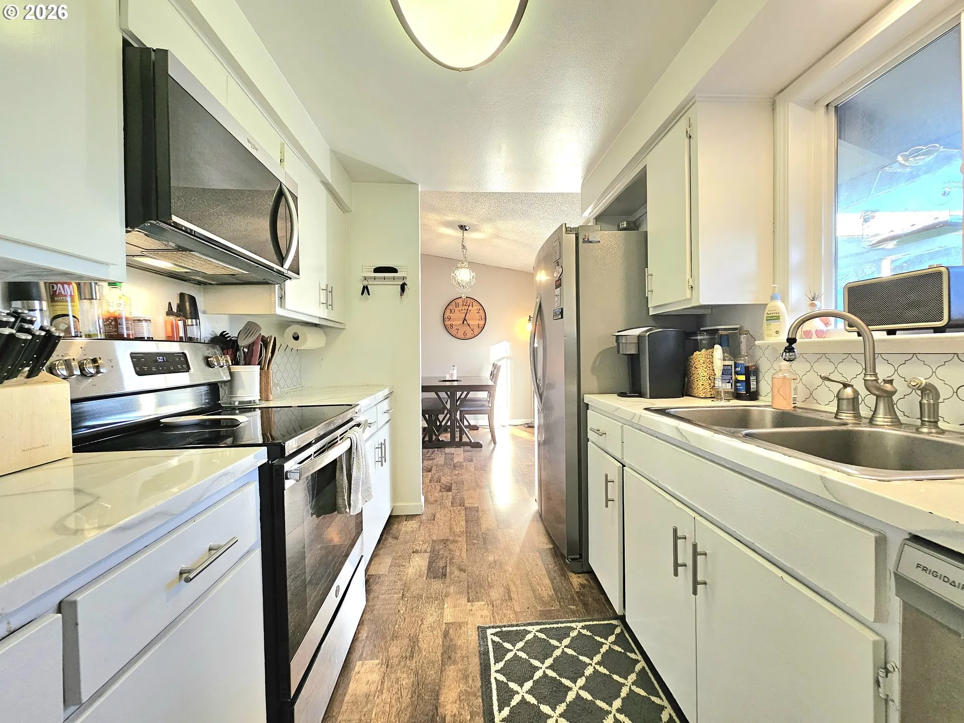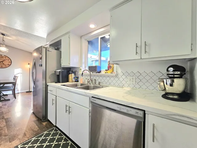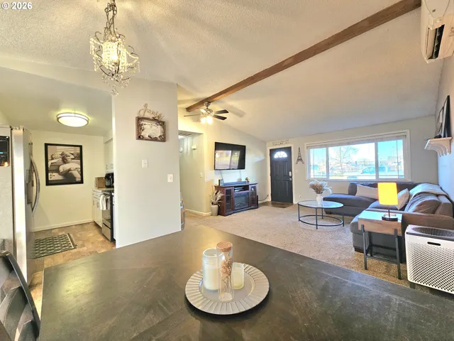 Must see single level ranch on corner lot with loads of updates! Throughout the property there’s newer interior and exterior paint, flooring, countertops, faucets, cabinetry painted & new hardware added, stainless steel kitchen appliances, an upgraded water filtration system, new water pipes, ductless AC heat pump, RV parking pad, garage door opener, sump pump, doorbell cam, landscaping, and more. The kitchen, dining, and bathroom feature beautiful luxury vinyl plank flooring with carpet in the living room and bedrooms. An open living room and dining room with vaulted ceilings and built-in shelving make the space feel large and inviting. The dining space leads into the kitchen with it’s updated appliances, white cabinets, new epoxy countertops, and stylish backsplash. All three bedrooms have large closets and ceiling fans, and the primary suite has it’s own entrance to the bathroom. The bathroom also has loads of storage, new epoxy countertops, a new high flush toilet, and a low edge tub with lots of built-ins for convenience and ease of use. The oversized garage has lots of shelving and even a pull down ladder with attic space for more storage. The covered back patio and fully fenced backyard are great for entertaining and have plenty of space and privacy for all your family and friends. This home has so much charm and functionality, plus low taxes, so don’t wait, call your favorite Realtor for a tour today!!