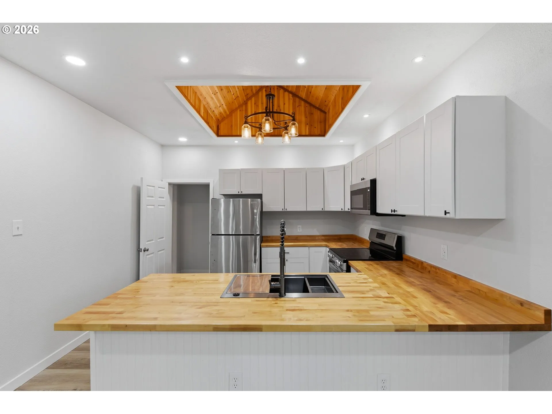 Newly remodeled home on oversized lot with detached garage and ample space for RV/boat parking. Spacious, fully fenced yard offers room for gardening, pets, or outdoor living, plus a covered back patio ideal for year-round enjoyment.Open floor plan with open beam ceilings and abundant natural light. Kitchen features butcher block counters, white cabinetry, stainless steel appliances, oversized island, and tray ceiling with wood inlay.Unfinished upper-level bonus space offers potential for office or additional living area.Recent updates include new flooring, interior/exterior paint, siding, fencing, and roof. Updated kitchen and bath with new fixtures, plus plumbing and electrical improvements. Mini-split system and updated windows.Turnkey property located near shopping, schools, and Oregon coast beaches.