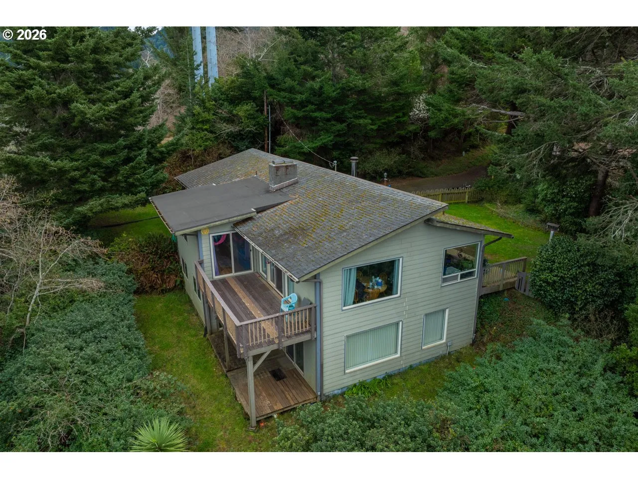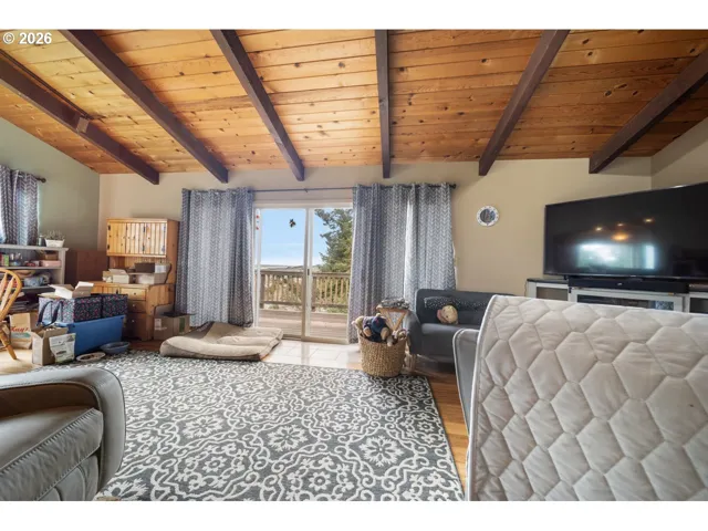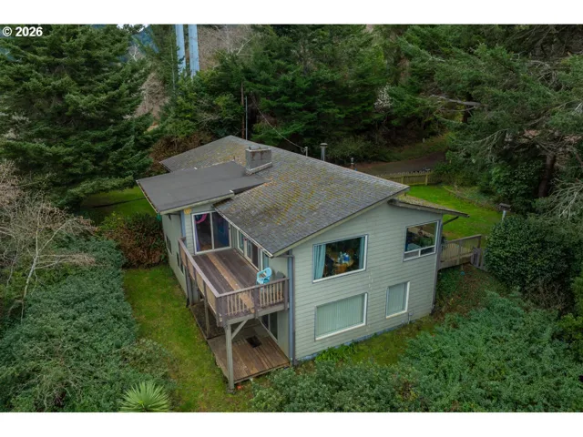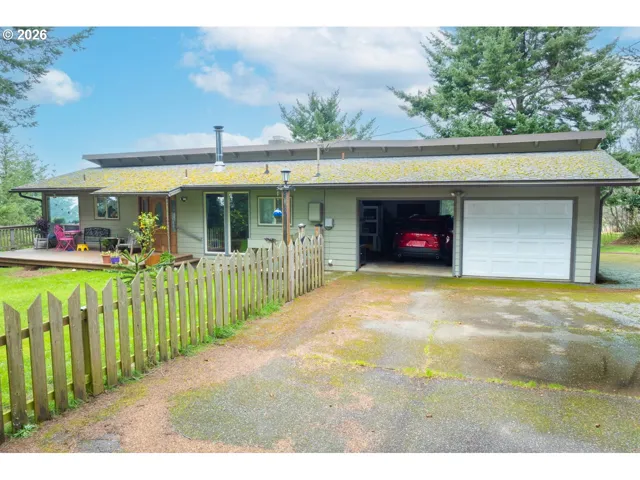 Ocean & city views, privacy, and flexible living space — all wrapped into this well-maintained two-level home in Gold Beach.Upstairs welcomes you with a warm pellet stove, zoned heating, and an open living/dining layout featuring a slider to a balcony with ocean and city views. The kitchen offers granite countertops, tile backsplash, eating bar, new dishwasher (with internal light), and new microwave. Built-in corner TV stand adds function, while the fireplace provides additional character (not used by current sellers). One bedroom with dual closets and a full bath with unique redwood walls complete the upper level. Attached 2-car garage for convenience.Downstairs offers even more flexibility with a second bedroom (dual closets) and slider to the lower covered porch — also capturing ocean and city views. Full bath with stand-up shower, hallway laundry (washer & dryer included), and extra storage closet. The spacious bonus room with its own fireplace and sliding doors to the porch is currently used as storage/bedroom space but could easily serve as a family room, guest quarters, office, hobby space, or more.Enjoy privacy, quiet surroundings, visiting birds, deer, and even elk. Small fully fenced front yard for pets. Public utilities.Sale contingent upon seller’s successful close of replacement property.