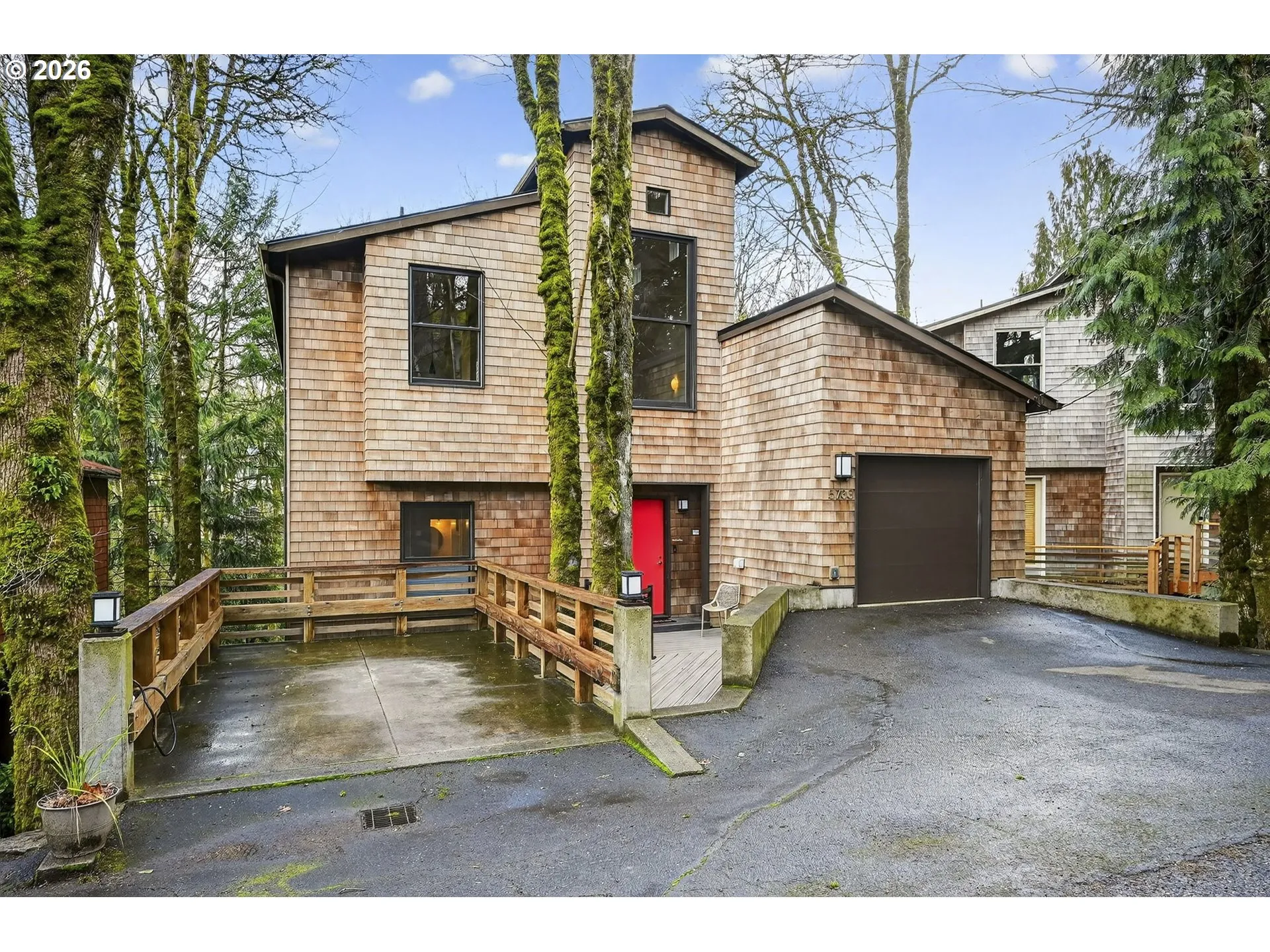 Stunning Urban Retreat! Perched in the trees just minutes from downtown and NW Portland, this light-filled Northwest Contemporary offers a rare blend of privacy, architecture, and connection to nature. Vaulted ceilings and dramatic walls of windows frame lush green views from nearly every room. The thoughtfully designed 4-bedroom, 3-bath layout spans multiple levels, featuring hardwood floors, a cozy wood-burning fireplace, and an open upper level that flows seamlessly to a covered deck overlooking the serene greenspace—perfect for morning coffee or evening unwinding. The middle level provides comfortable bedrooms and baths, while the lower level offers additional bedroom, bath, and laundry. Don’t miss the huge family/bonus/game room complete with wet bar and direct access to a spacious second deck and the peaceful shared greenspace beyond. Quality construction, easy parking, abundant storage, workshop space beneath the garage, 220V for fast EV charging and a brand NEW roof add function to the home’s striking design. With easy access to Forest Park and Hoyt Arboretum trails, Hwy 26, and the tech corridor, this tranquil, low-maintenance sanctuary delivers the best of Pacific Northwest living just moments from the city. [Home Energy Score = 5. HES Report at https://rpt.greenbuildingregistry.com/hes/OR10220063]