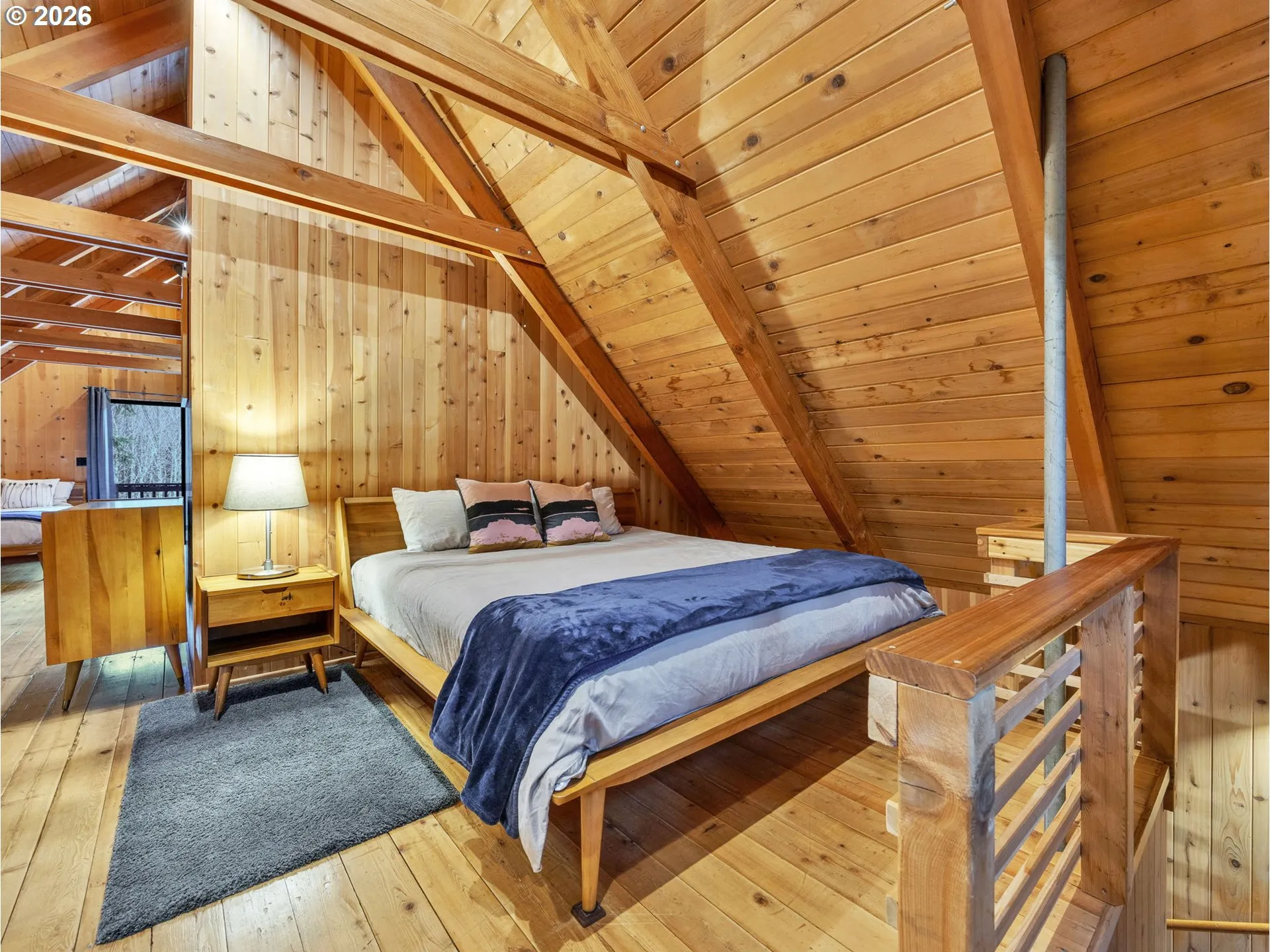 A truly one-of-a-kind Mt. Hood cabin nestled on the banks of the Zig Zag River in Rhododendron, offering beautiful, unobstructed river views. Surrounded by towering trees, this fully furnished retreat provides a peaceful escape along the Mt. Hood corridor with easy access to year-round recreation. The location is uniquely positioned with quick and convenient access to Highway 26, yet offers a quiet, serene setting where no highway noise can be heard—creating a true sense of being on the doorstep of wilderness, with groceries, dining, & outdoor adventure just minutes away. The main level features a cozy, open-concept living and dining area with wood ceilings, handcrafted built-ins, a custom mantle, & a stone wood-burning fireplace. Large windows frame serene views of the river and surrounding forest, filling the space with natural light. The dining area centers around a large handmade wood table, perfect for shared meals and gatherings. The kitchen complements the cabin’s character with brick floors, custom rustic cabinetry, & a vintage-style range. Also on the main level is a full bathroom with a live-edge wood vanity, custom clay sink, & updated tile shower. Upstairs, vaulted wood-beamed ceilings highlight the dorm-style sleeping quarters overlooking the river, tastefully furnished with two king beds & one queen bed, a closet, and a half bath. A private balcony offers peaceful river views above the water. Outdoor living includes a spacious deck perched above the river and an attached storage shed for bikes, skis, firewood, & gear. Set on approximately 0.36 acres, the property offers room to relax and enjoy the natural beauty of the Pacific Northwest. Located approximately 7 miles from the Sandy Ridge Trail System, 17 miles from Timberline Lodge, and 22 miles from Mt. Hood Meadows. Currently operating as a successful short-term rental, this unique riverfront cabin presents an excellent opportunity for full-time living, a personal getaway, or an investment property.