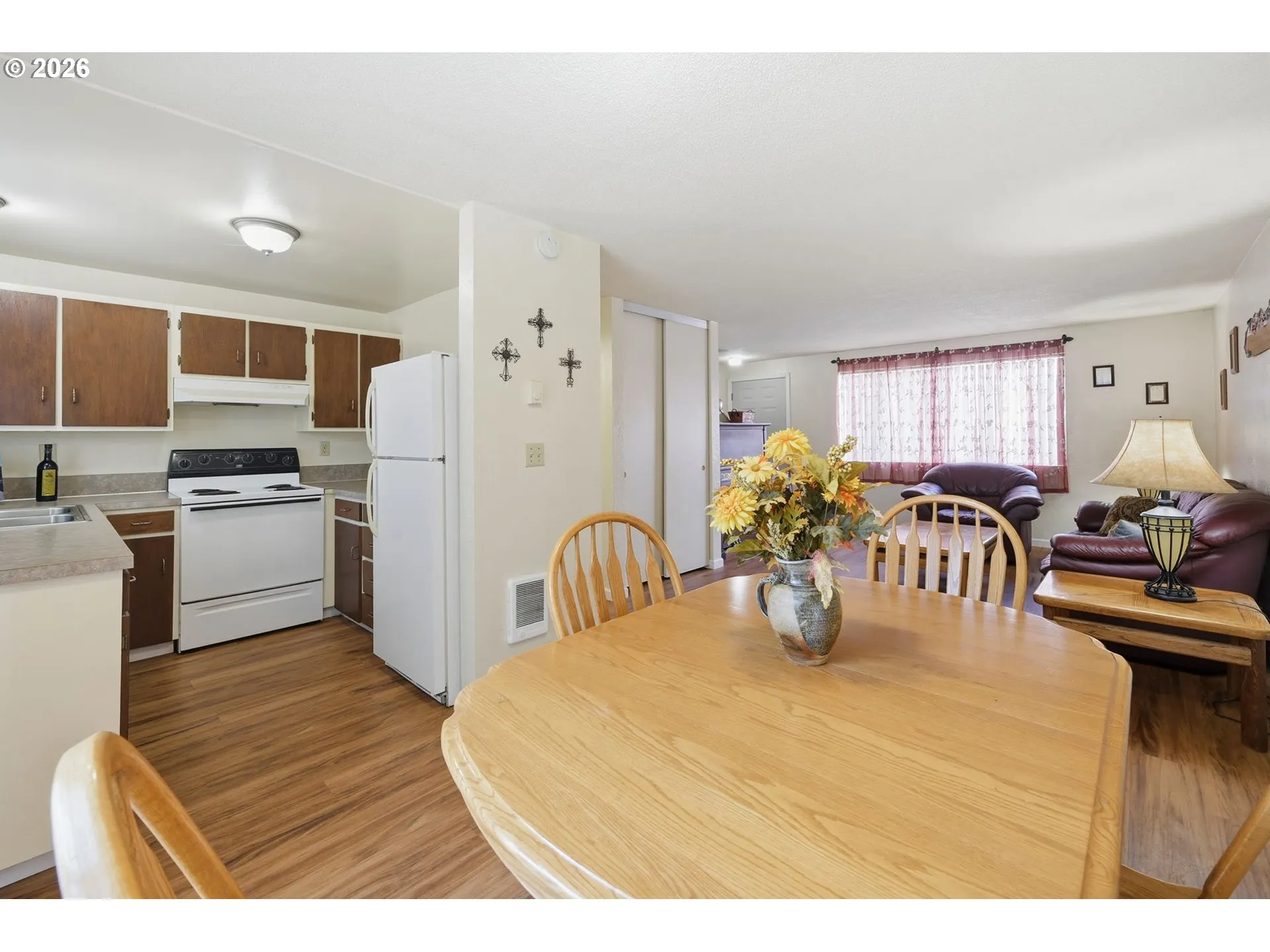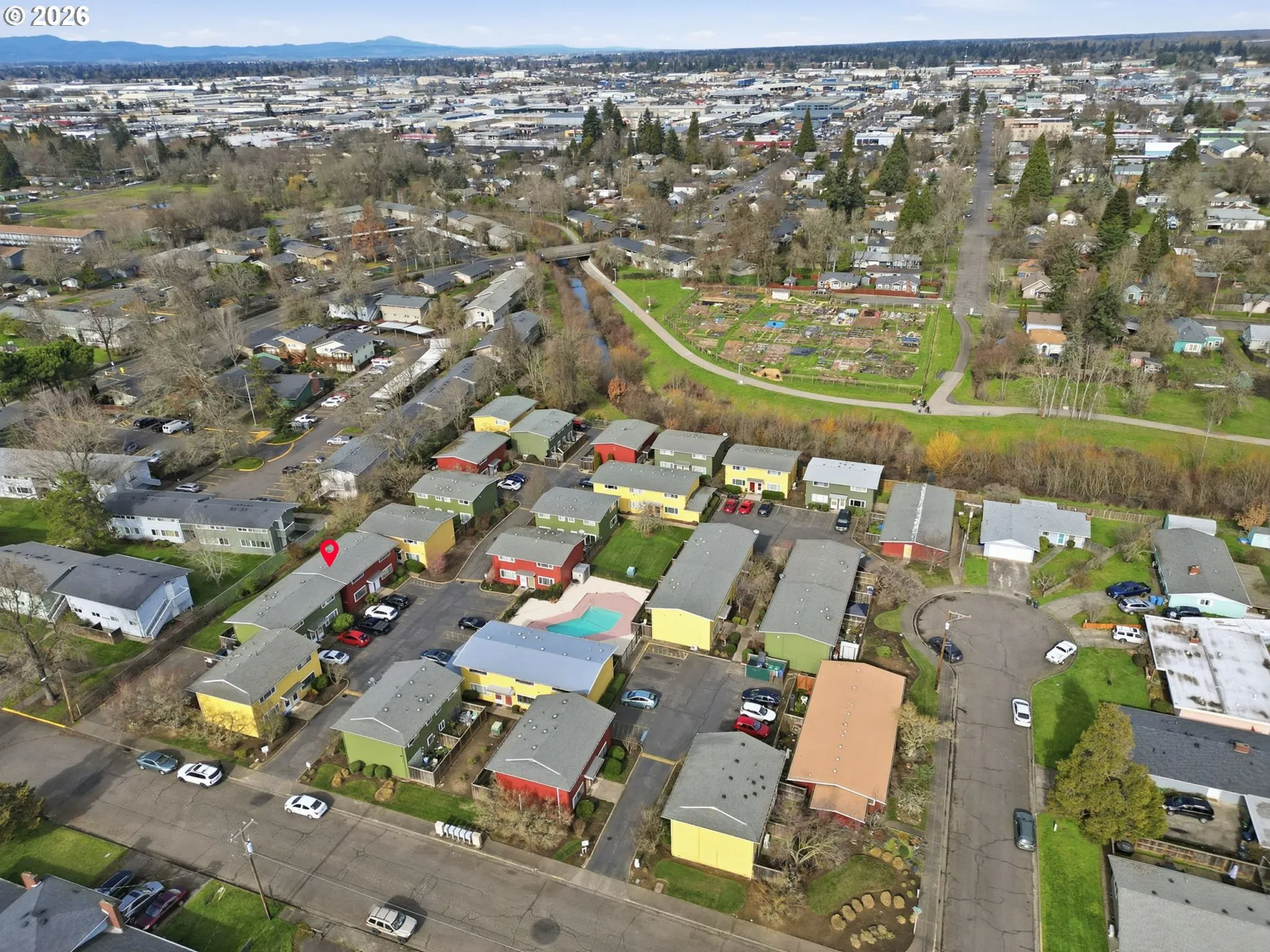 Affordable living in conveniently located condo complex. Shopping downtown, U of O and transit system very easily accessible. Great townhouse style layout, 936 square feet gives you ample room for furniture in each room. Living room, dining area, kitchen and 1/2 bath,are downstairs. Upstairs has 2 bedrooms and full bath. Plank flooring throughout installed May 2024. All appliances included. Water heater less than 2 years old. Private patio area opens to grassy common area. Comparatively low HOA dues $265/mo include; water, sewer, trash, exterior of building, landscaping, pay-for-use laundry and seasonal pool Homeowner pays for unit electricity only. 2025-2026 taxes $1701.42. See floor plans for room dimensions. One off street parking place. Pet policy 2 permitted, under 30 lbs each. Make your appointment to tour this cute condo today!