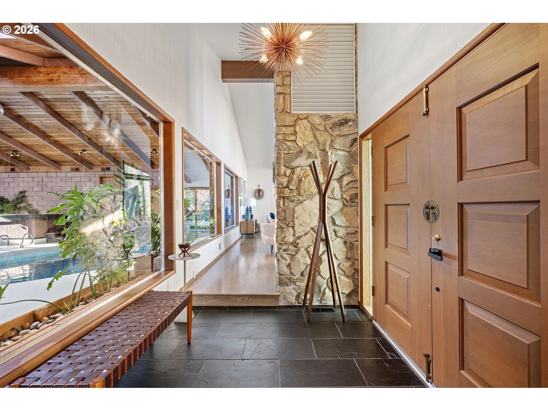 Stunning mid-century modern home with beautiful views of the city. Clean architectural lines meet thoughtful updates, preserving its vintage feel throughout. Three bedroom and three full bath + a dedicated office. Escape the outside world as soon as you enter and discover the indoor pool, hot tub, a dramatic floor-to-ceiling stone fireplace anchors the living space, two expansive decks with stunning views, walk in closet, huge family room with updated kitchenette, fireplace, custom pool table, and wine cellar. Successful short-term rental, but just as fitting for full-time living or a mix of both. No sign on property.