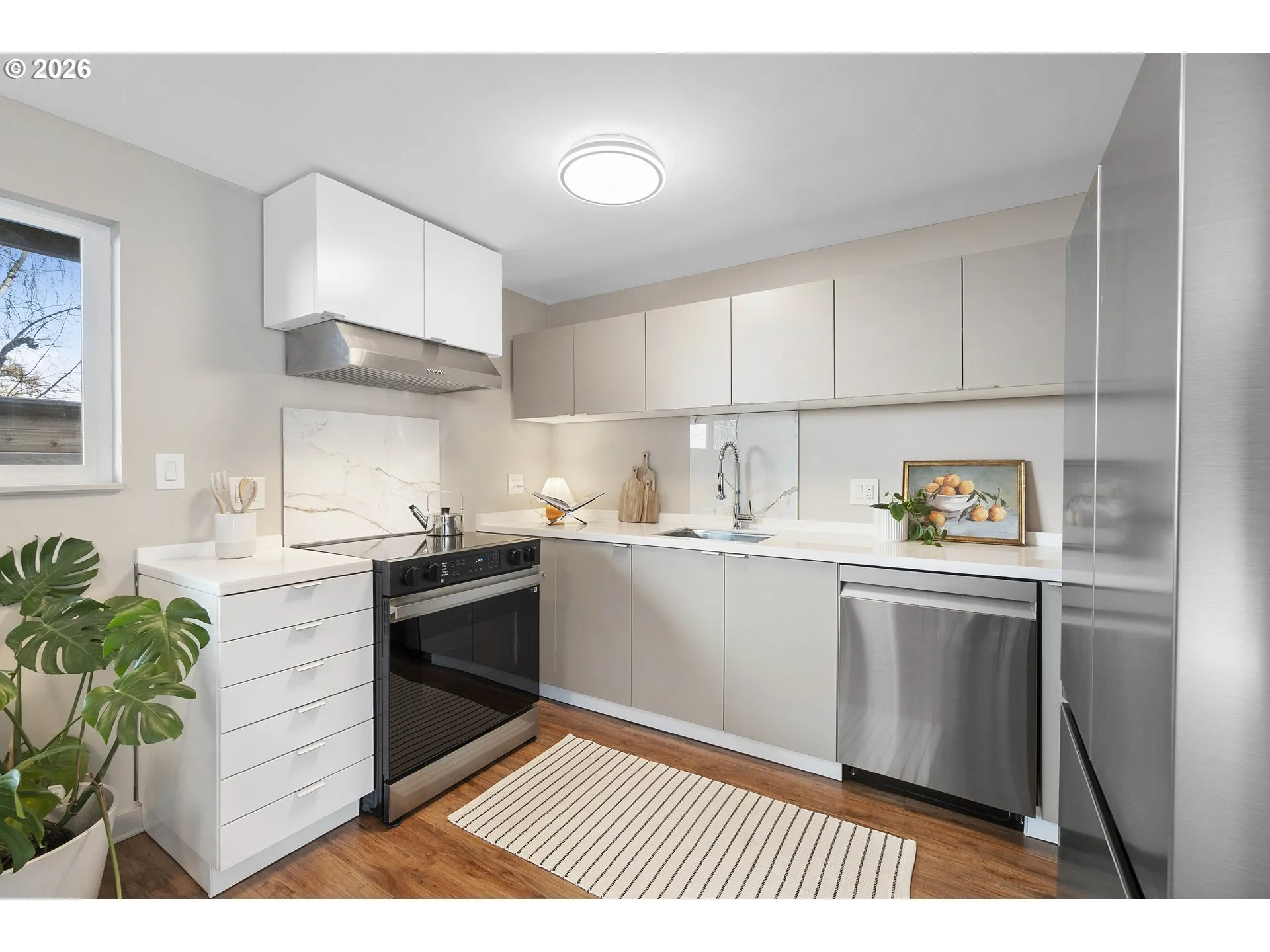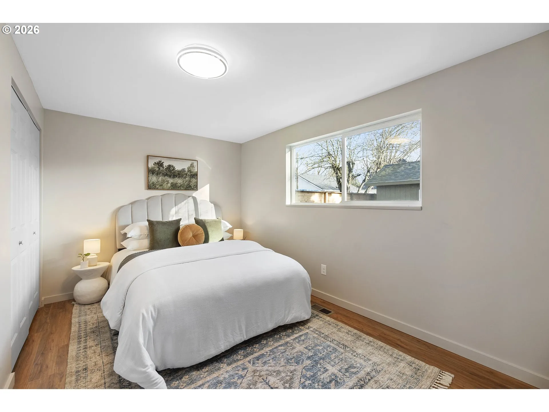 Small but mighty — and serving serious Woodstock vibes. This 3-bedroom, 1-bath charmer proves you don’t need a huge footprint to live large. With 1,220 square feet completely transformed, this home is dialed, stylish, and absolutely ready for its next chapter. Let’s start with the good stuff: a new roof, fresh interior and exterior paint, new engineered hardwood flooring throughout, a beautifully remodeled kitchen with all-new sleek stainless steel Samsung appliances, an updated bathroom, new lighting, and more. Tired of touring houses without air conditioning? We’ve got you covered. This house truly has it all, which means you get to skip the renovation phase and go straight to the fun part: living here. Unlike many ramblers, the layout offers more living space than you’d expect. You’ll find a comfortable living room and a huge family room — both just off the kitchen — keeping everyone connected whether you’re hosting friends, binge-watching your latest show, or cooking something fabulous.Step outside and enjoy the privacy of the fully fenced backyard. Kick back and relax on the patio, or slip into the hot tub (yes, it works!). If you have a green thumb, this sunny space is perfect for adding perennials or raised beds. Save on water bills with the drought tolerant landscaping. There’s also a shed ready to hold bikes, tools, garden gear, or whatever your Portland hobbies require. And the location? Hard to beat. Woodstock is like Diet Sellwood! With an impressive 99 BikeScore, you’re close to trails with quick access to Woodstock Park and all the beloved eateries and shops along vibrant Woodstock Blvd. Summer will be here before you know it, and you’ll be able to stroll over to the Farmers Market from June through October. [Home Energy Score = 4. HES Report at https://rpt.greenbuildingregistry.com/hes/OR10245652]
