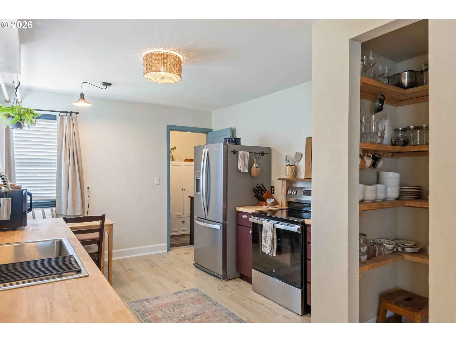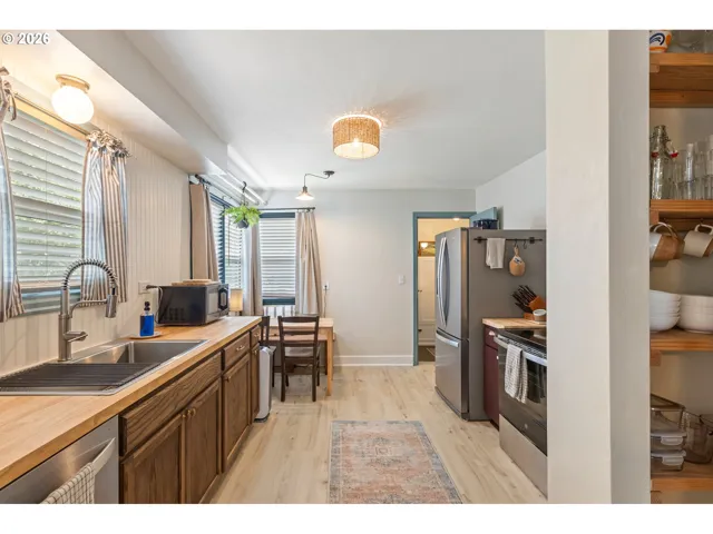 Beautifully updated and full of character, this inviting single-level ranch-style home offers the perfect blend of warmth, charm, and modern comfort. The home showcases gorgeous Douglas fir hardwood floors in the living room and bedrooms, abundant natural light, and a warm, welcoming atmosphere throughout. The updated kitchen features stainless steel appliances, butcher block countertops, vinyl plank flooring, beadboard accents, and a spacious pantry with floor-to-ceiling shelving—creating a functional and stylish space for everyday living. The nicely updated bathroom includes a custom cedar vanity, farmhouse sink and faucet, and modern finishes that add to the home’s unique charm. One of the standout spaces is the incredible laundry and mudroom with concrete floors, built-in bench seating, storage cabinetry, a tankless hot water heater, and convenient access to the backyard—perfect as a drop zone for busy households. Currently set up as a 2 bed, 1 bath home, the flexible floor plan also includes a bonus room with its own ductless heating and cooling unit and window that could easily serve as a third bedroom, home office, studio, or hobby room. The space was partially converted from the garage while still leaving a portion of the garage available as a workshop or storage area. Step outside and you’ll discover a backyard designed for relaxing and entertaining. A large circular patio sits beneath a charming gazebo, creating the perfect place for summer evenings with friends and family. The yard also features mature landscaping, beautiful trees, and a private gate that opens directly to the community garden behind the property—offering peaceful views with no neighbors directly behind you. In the front yard, colorful flowers burst to life each spring and summer, adding incredible curb appeal and welcoming you home each day. This move-in ready Roseburg gem offers charm, flexibility, and thoughtful updates in a location that’s close to everything.