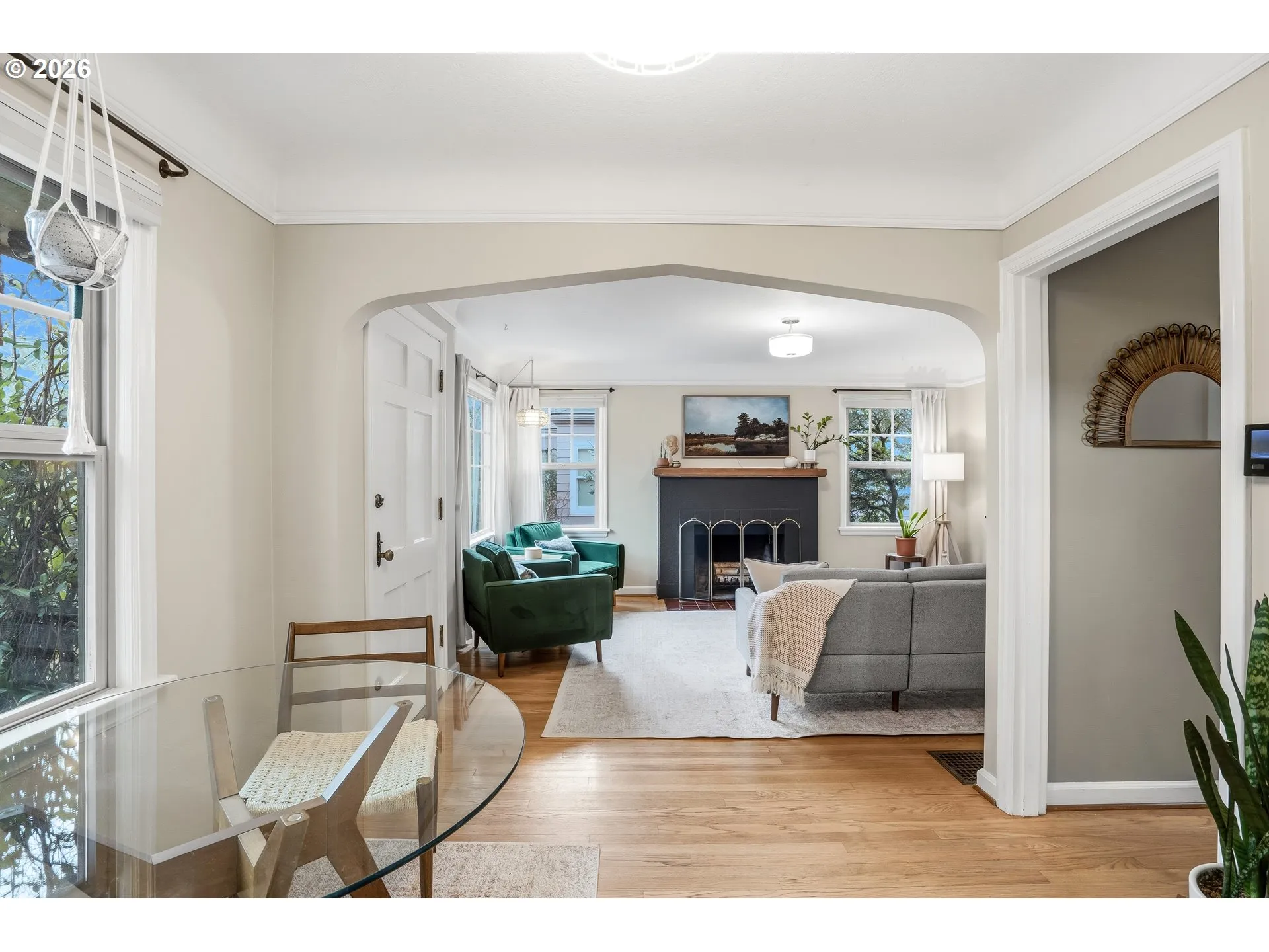 The Piedmont Palm Bungalow! Stylish and well cared for, you will feel it when you see it! A statuesque palm tree and mature landscaping welcome you up the front steps. The main floor features wood floors, south-facing windows that emanate natural light throughout, a wood-burning fireplace, and a recently updated kitchen with quartz counters, newer cabinets, and the perfect window for plant lovers, all overlooking the front yard. Wherefore art thou, bedroom? The upper-level primary suite is complete with a full bath and Juliet balcony! Modern wallpaper and sconces add stylish detail. The knotty pine party basement is not to be missed – features tall ceilings, a bonus space/rumpus room with laundry, and an unfinished portion to use as you please. 95% efficient forced-air heat + central AC keep you cozy in winter and cool in the summer. The back patio is perfect for grilling & chilling, and there’s enough emerald green grass for games, cartwheels, and four-legged friends to cavort. Low-maintenance landscaping looks good year-round! Detached garage provides additional storage for all your gear. Location is a dream! Just blocks to Peninsula and Farragut City Park, plus all the delights that Dekum and Kenton have to offer. [Home Energy Score = 7. HES Report at https://rpt.greenbuildingregistry.com/hes/OR10189008]