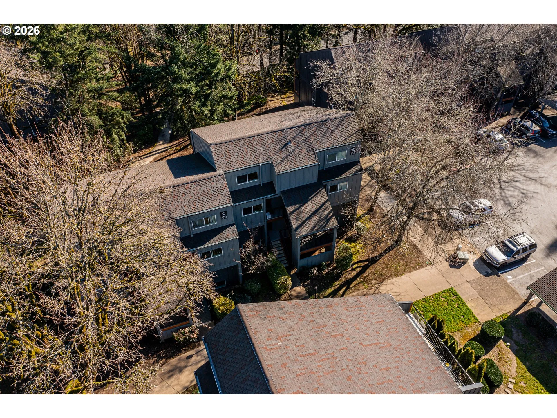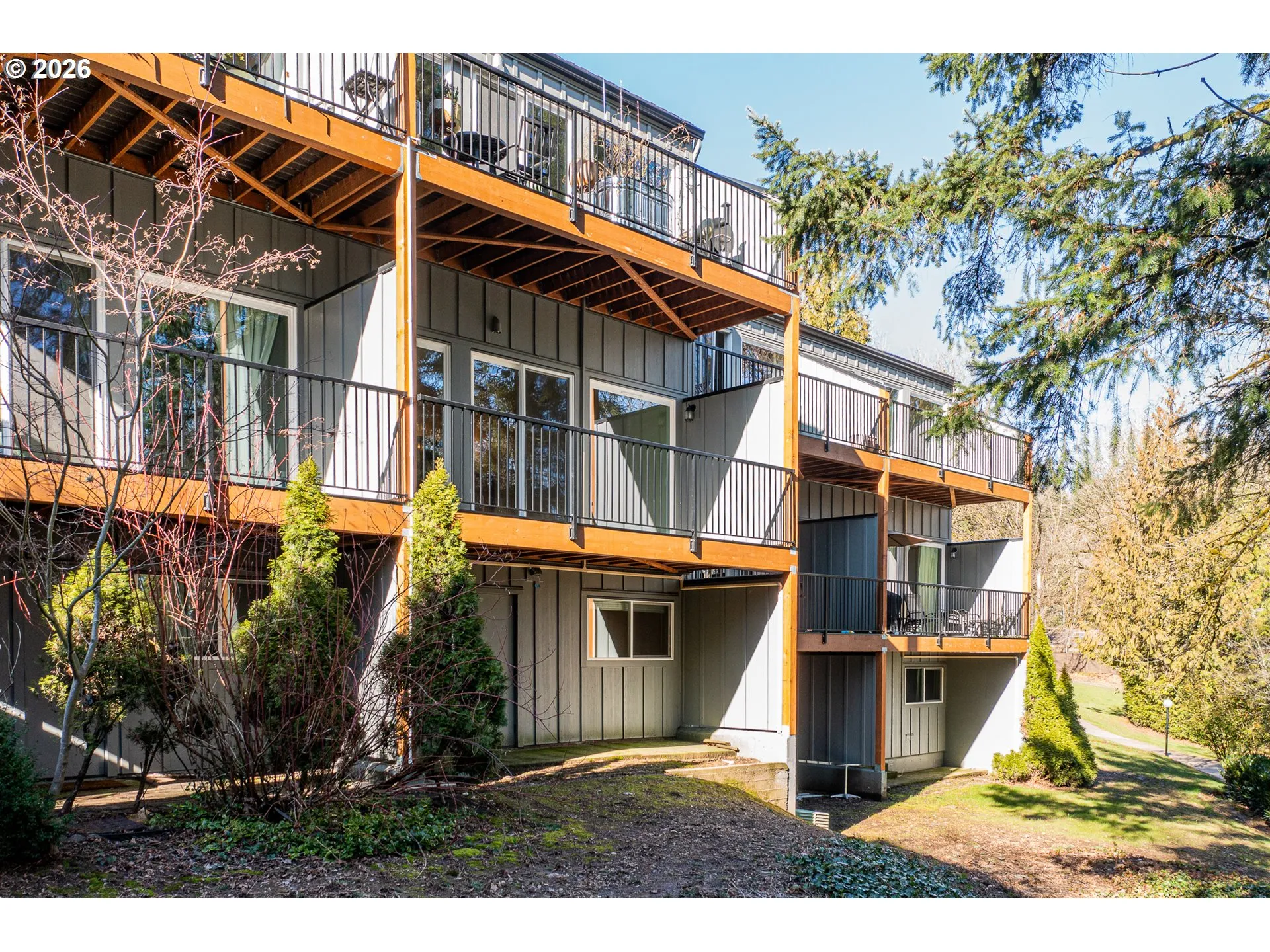 Amazing interior condo provides so much privacy and peace. This interior unit offers an open/entertaining layout and overlooking the treed background. The main level features a spacious kitchen with large island, stainless steel appliances, ample counter & storage space, along with a dining area just off the kitchen for easy everyday living/entertaining. The sunken living room opens through large sliding doors to a private balcony overlooking mature trees and beautifully landscaped grounds, creating a quiet, park-like setting. A convenient half bath is also located on the main level. Downstairs, you’ll find three additional bedrooms, including one with direct outdoor access, offering flexibility for guests, a home office, or additional living space. A full bathroom with tile floors completes the lower level. Located close to shopping, dining, parks, and top-rated Lake Oswego schools, this condo offers low-maintenance living in a highly desirable community. Part of and access to Mt.Park rec center.