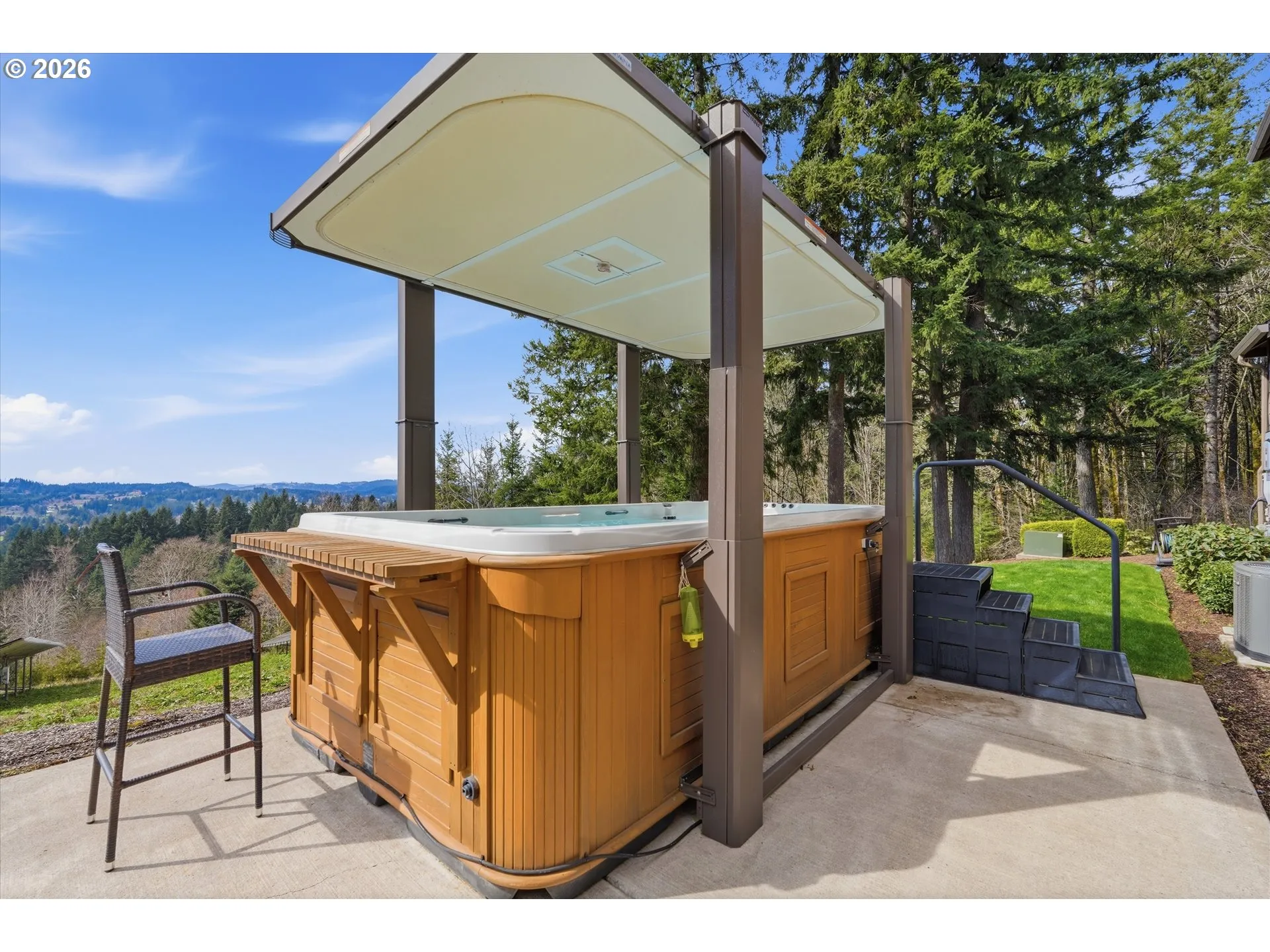 Set on 5.17 private acres with sweeping valley views, this custom home was thoughtfully designed for indoor & outdoor living, offering space while feeling connected, & rural tranquility with convenient access to everyday amenities. A gated entry and private driveway lead to the home, which sits on a flat, landscaped portion of the property, surrounded by nature and open areas that capture valley views. The 3-car garage and expansive driveway provide ample parking space for guests, vehicles, and RVs. Inside, the main level features a great room with floor-to-ceiling windows, filling the space with natural light. A 2-story fireplace anchors the living area and creates a warm focal point. The kitchen includes solid wood cabinetry, a 6-burner gas cooktop, double ovens, a large eating bar, and walk-in pantry. The primary suite is conveniently located on the main level and features an ensuite bathroom with double sinks, a soaking tub perfectly positioned under a picture window, a walk-in shower, and walk-in closet. A second main-level bedroom/office and full bath provide flexibility for guests, multi-generational living, or a home office. Upstairs, you’ll find 2 additional bedrooms, a full bath, a 5th bedroom or bonus room, and 2nd laundry room for added convenience. The open staircase and upper landing contribute to the home’s sense of openness. Outside, the living space continues with a covered patio and stone fireplace with TV hookup, a comfortable place to enjoy the view, catch a game, or unwind while staying out of the weather. Relax or exercise in the outdoor swim spa with adjustable counter-current swim system, hydrotherapy seating, and automated cover for year-round enjoyment. Enjoy minimal electricity costs with a fully owned solar array that includes a 25-year warranty. This stunning property offers a rare opportunity to enjoy private acreage and a home designed for every season, where the indoor space is equally impressive as the surrounding landscape.